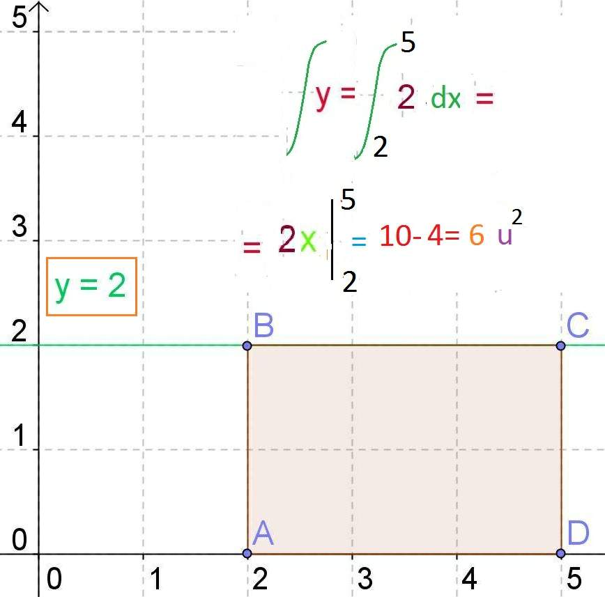 Para calcular el área del rectángulo (base por altura) de la recta horizontal de ordenada igual a tres comprendida entre los intervalos 2 y 4, aplicamos la integral de la constante tres y nos queda según el método anterior 3x, que evaluada entre 4 y 2, multiplicamos 3 × 4 y a continuación le restamos 3 × 2 y tenemos seis unidades cuadradas.